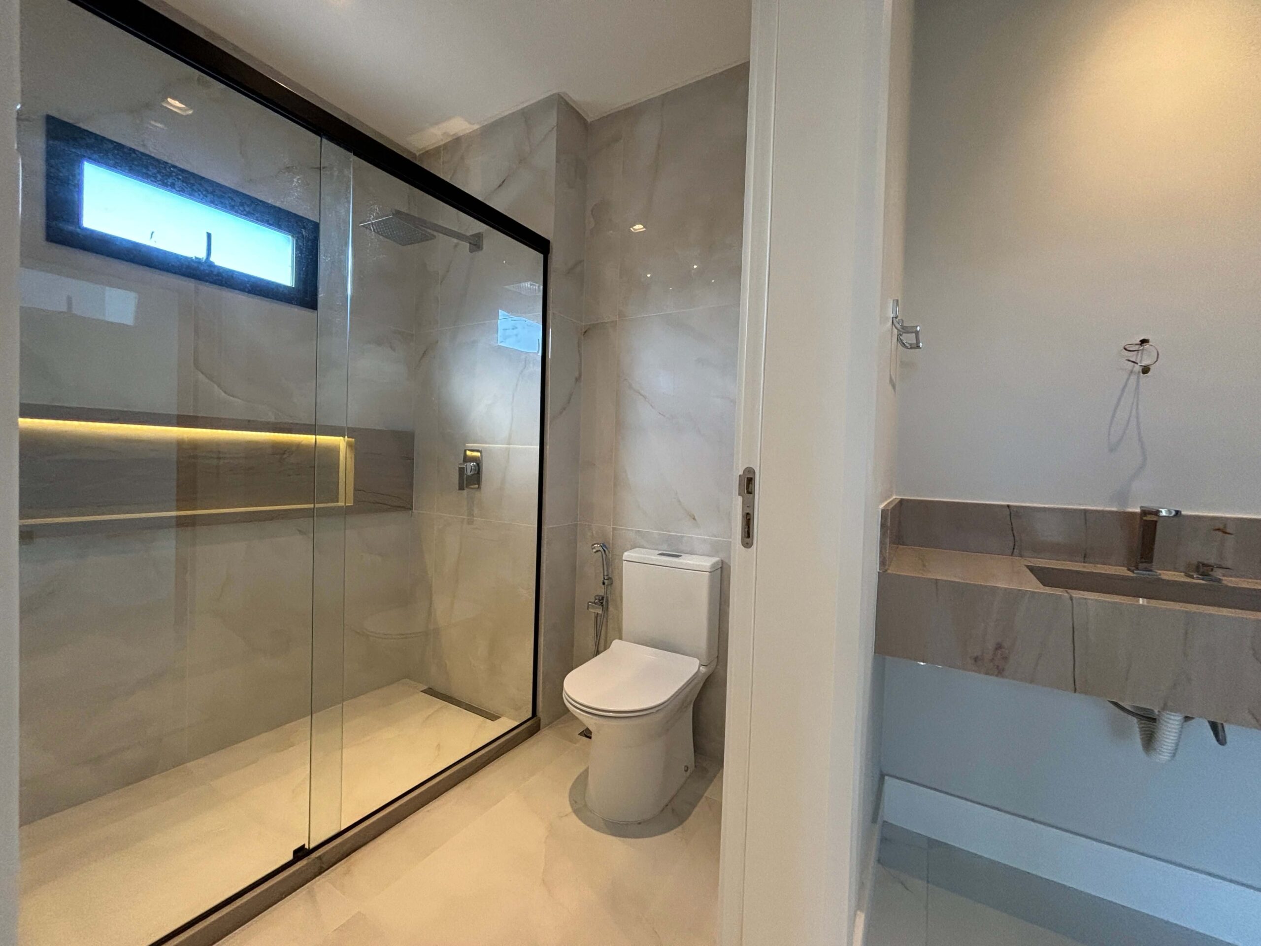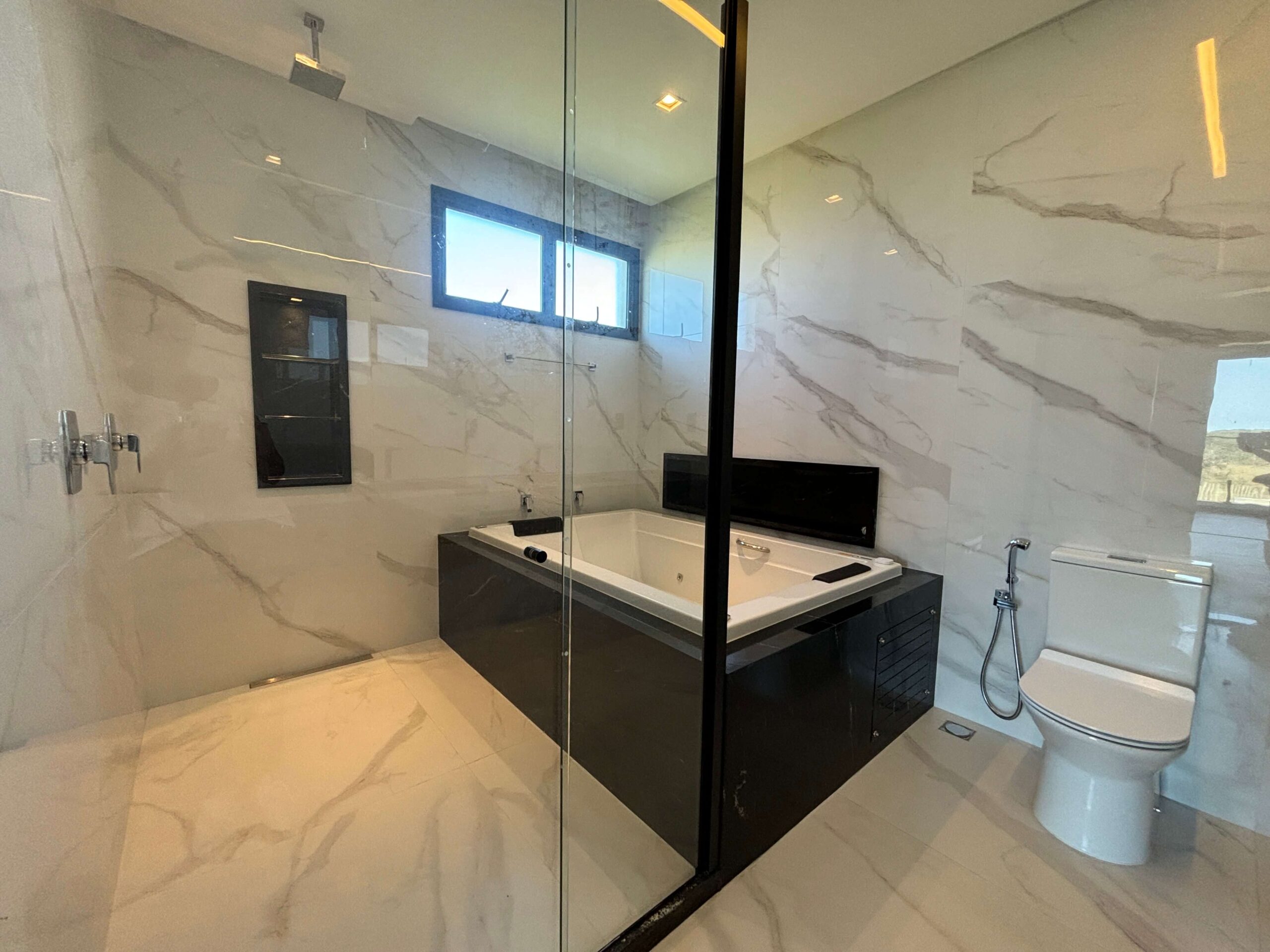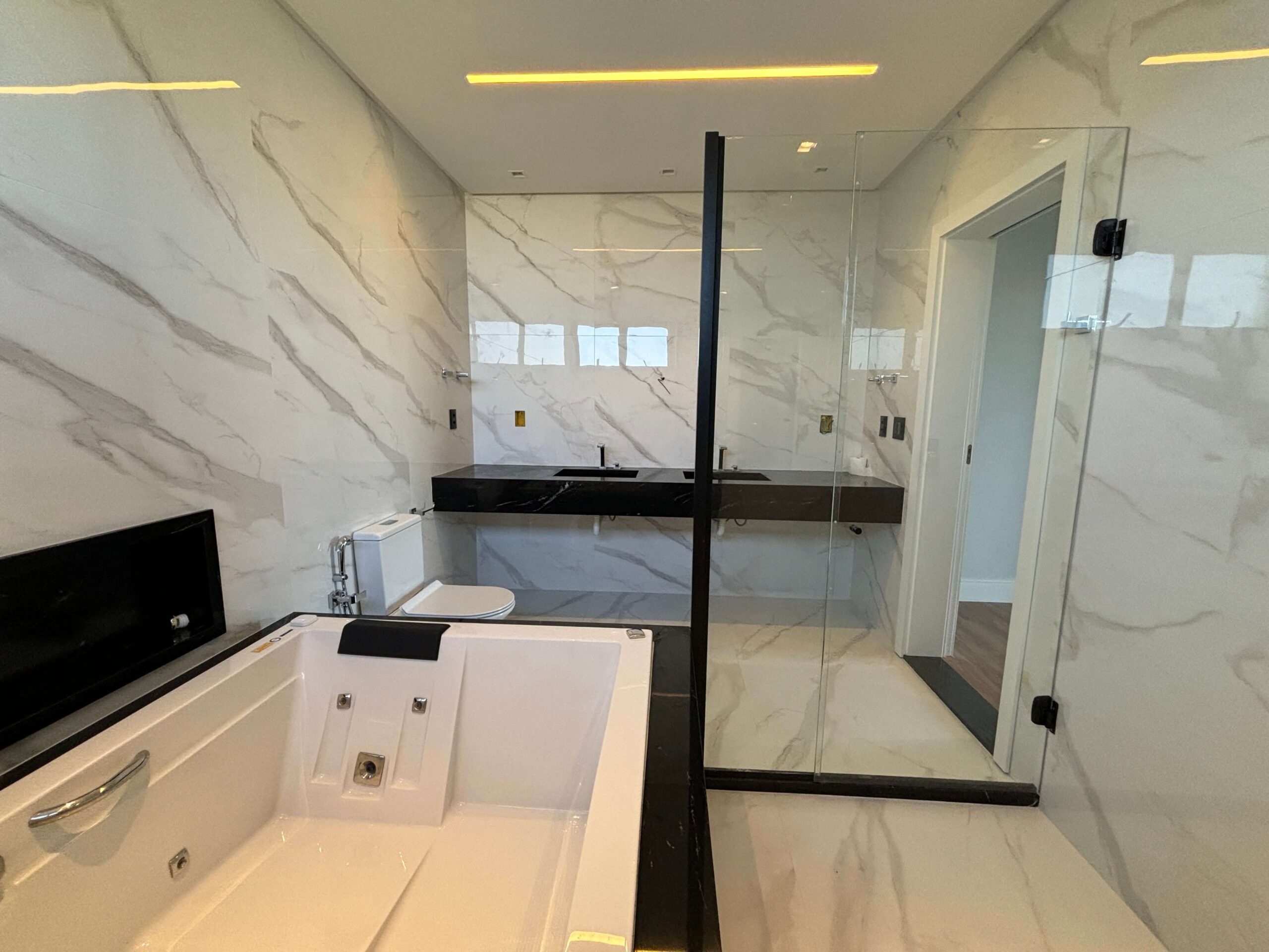 Esta linda casa duplex possuí 5 quartos ,sendo 4 com suíte e 2 com closet. O quarto do casal possuí um closet bem amplo, e uma suíte com hidromassagem, duas cubas e dois chuveiros, tudo para dar privacidade e comodidade ao casal.