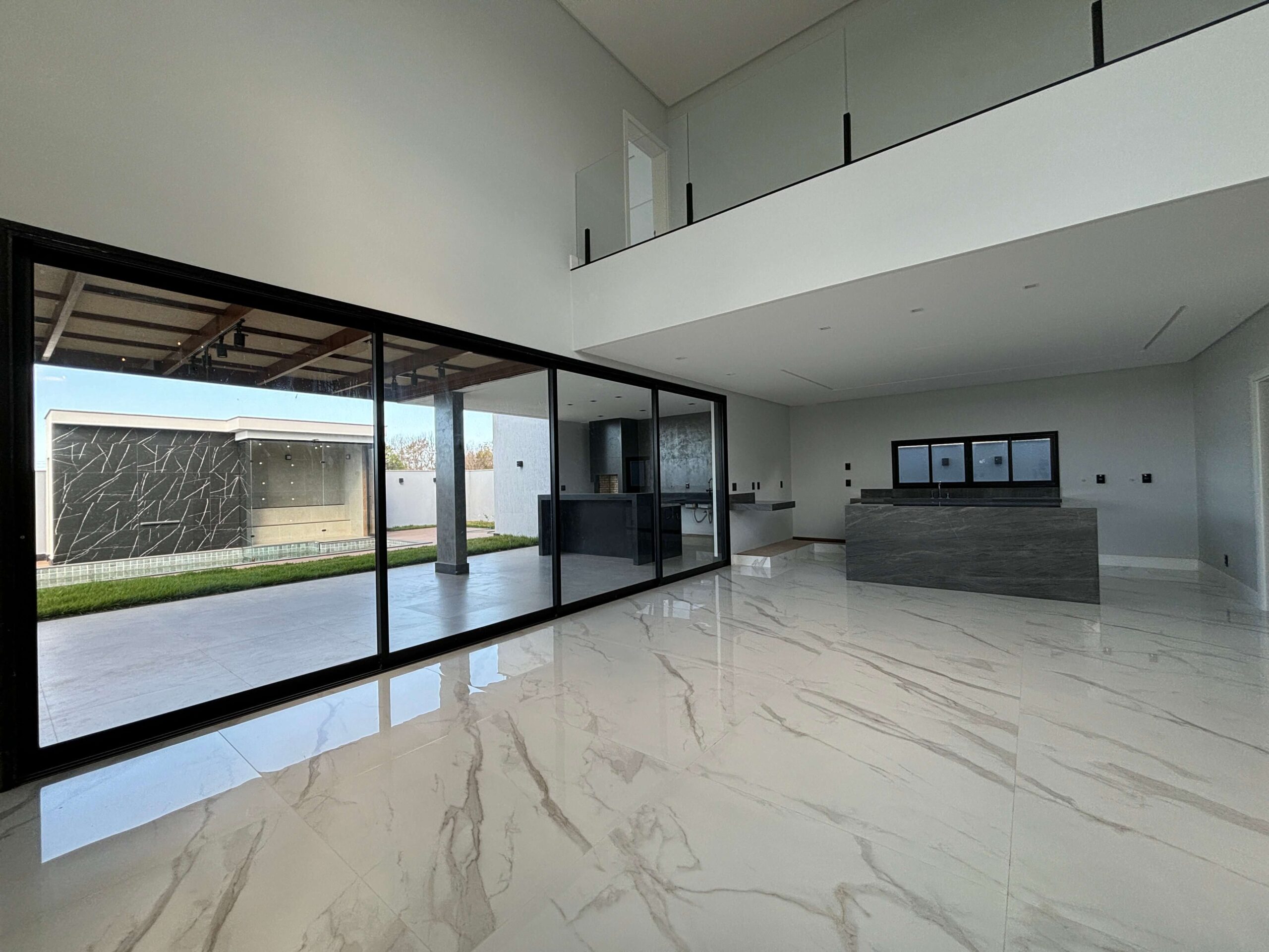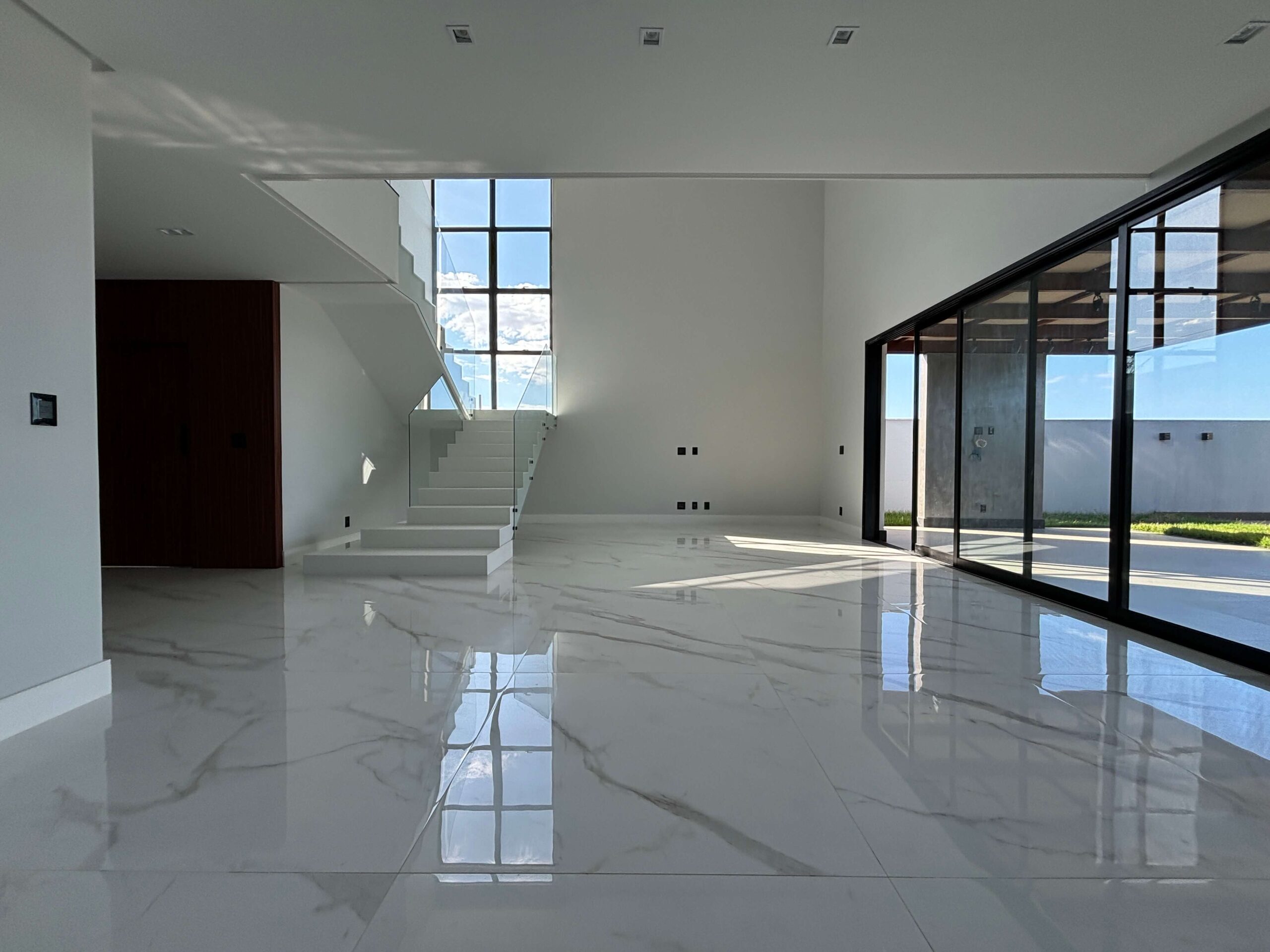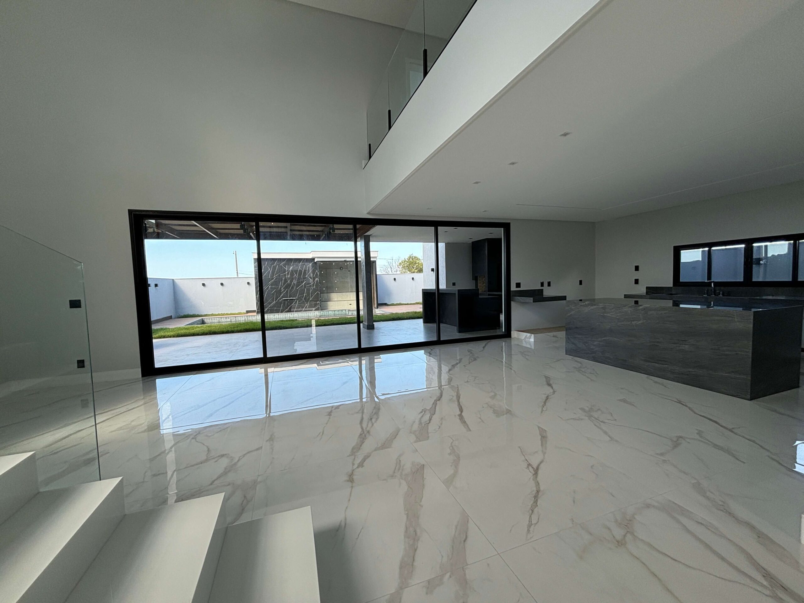 Bancada e ilha da cozinha em quartzito Adamantium, sala de TV e estar integradas a cozinha, com possibilidade de integração total com a Área gourmet e piscina. Escada para segundo piso em NanoGlass com corrimão em vidro/inox.